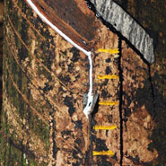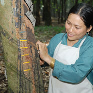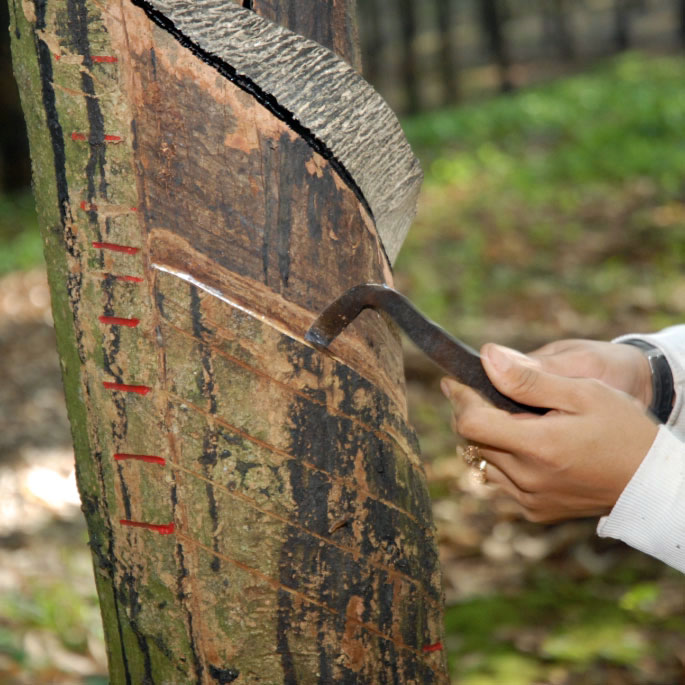 La récolte du lait d’hévéa se fait au moyen de fines incisions de l’écorce de l’arbre.